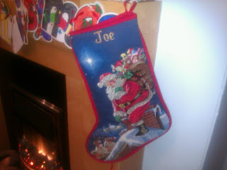 The boys' stockings.  I did not stitch these, in case you were wondering.  My Mum ordered them from a company in Cornwall.  The small boy's was a special request as they put a limit of 10 letters for a name!