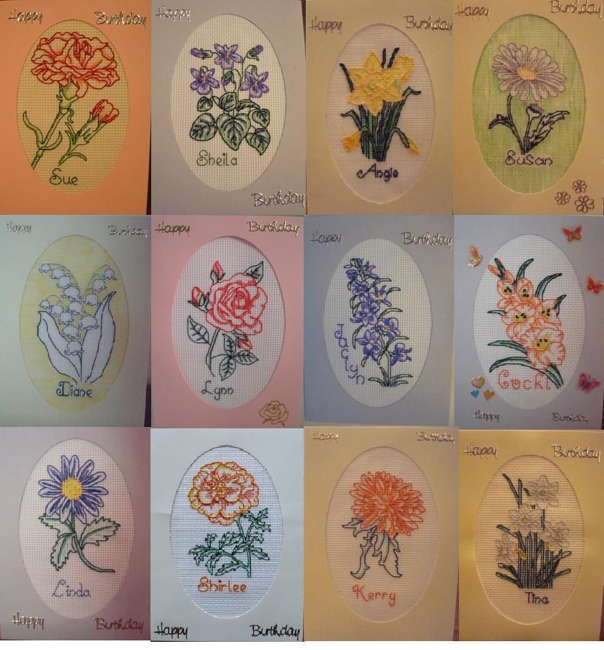 The cards have mainly been sent as part of a Birthday Card Exchange organised by the Needlecraft Haven Yuku Board. When there wasn't a NH Birthday in a month I sent a card to a blogging friend instead.