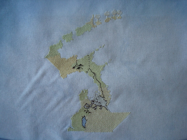Ooohh loving Discworld map. I really don't understand how you stitch in hand with the fabric rolled like that. I'm very intrigued. Do you have a pic of you stitching or could you post one? I would love to see how you manage it. Stitching in hand would make my life so much easier but I can't seem to get the hang of it.