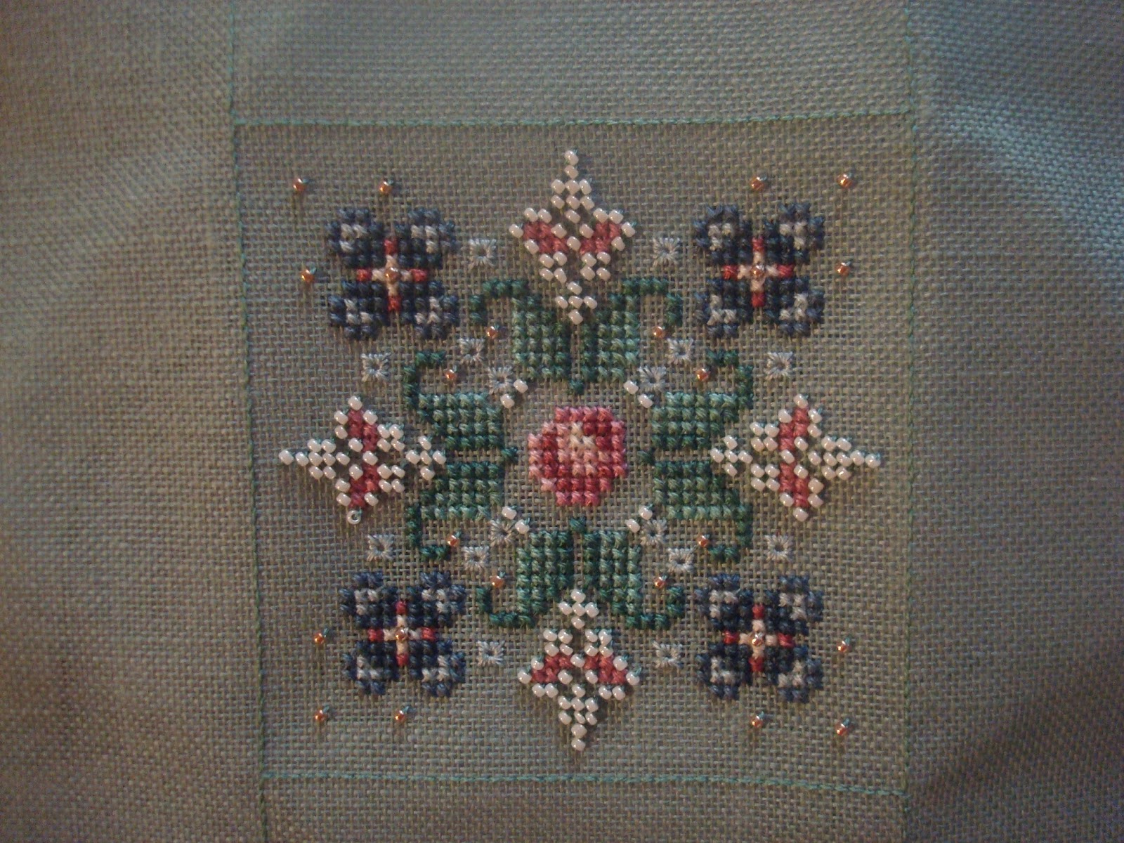You may also have spotted a fully-finished object in that photo too. It's the fourth of my Just Nan Ornaments, Victorian Rose, stitched on 32 count green linen which looks more blue in the photos!