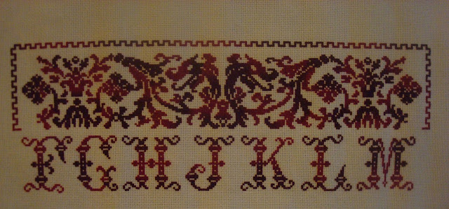 An alphabet and dragons, what's not to love? Answer - the fabric. I bought some 14 count aida and some variegated Anchor threads, a gorgeous dark red (1206) at 50p a skein from my LNS. Price has doubled in the last 17 years.
