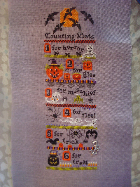 For the Hallowe'en Blog I have done something a little different this year, I've chosen a band sampler by Just Nan called Counting Bats and each band corresponds to the monthly themes on the blog. July was Witches' Accessories and I stitched this band which has The Amazing Candy Corn Producing Cauldron: