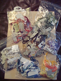 These are my "scraps bags".  When I finish a kit I always have loads of thread left over and I just used to put it all in a large bag.  This year I spent time sorting it into colour groups and putting into individual bags.  Each length is on a piece of cut-up thread sorter.  I use spare cardboard as DIY thread sorters if the project doesn't come with one.  Even the threads which claim to be DMC colours go into this bag as I learned early on that things-are-not-always-what-they-seem-to-be.
