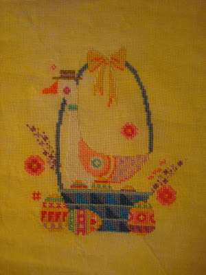 The first design is stitched on gifted fabric. The lovely Tiff Stitches sent me this gorgeous piece of acid yellow from Chromatic Alchemy and I decided to stitch this Satsuma Street design titled Nest Egg which I call "Goose in a Bonnet" just for fun.