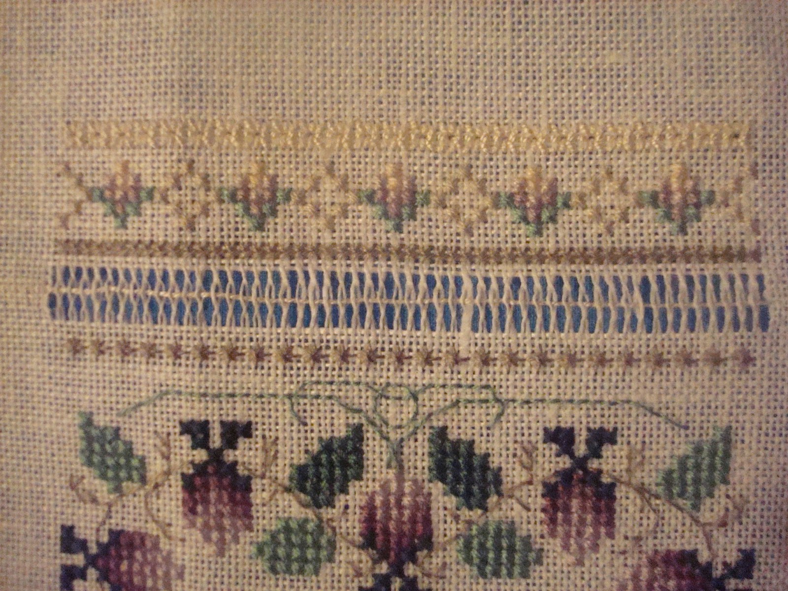 There are lots of speciality stitches in this one, including some lovely bargello and this hemstitching where you cut the fabric and remove the horizontal thread then weave a strand of perle through the verticals.  Before I frame this I will straighten up the woven thread!
