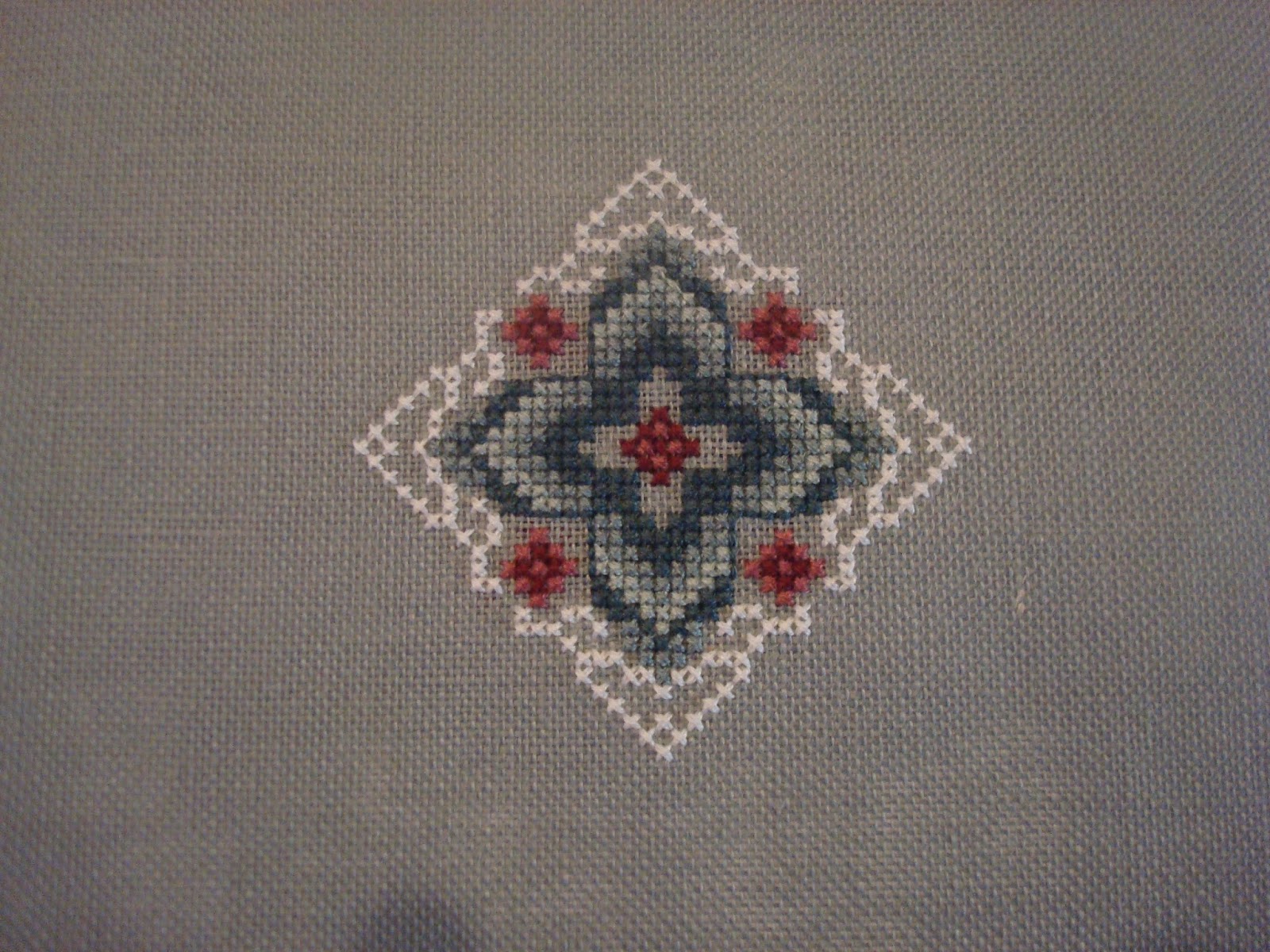 This is Just Nan's Memories which was a gift from Vickie, hence the pink linen! I stitched the pink flowers today. Aren't they pretty? And easy and simple and fun! This is going to be a long, thin piece with 12 bands so I planned to stitch one band per month but I think it will be done much quicker than that somehow!