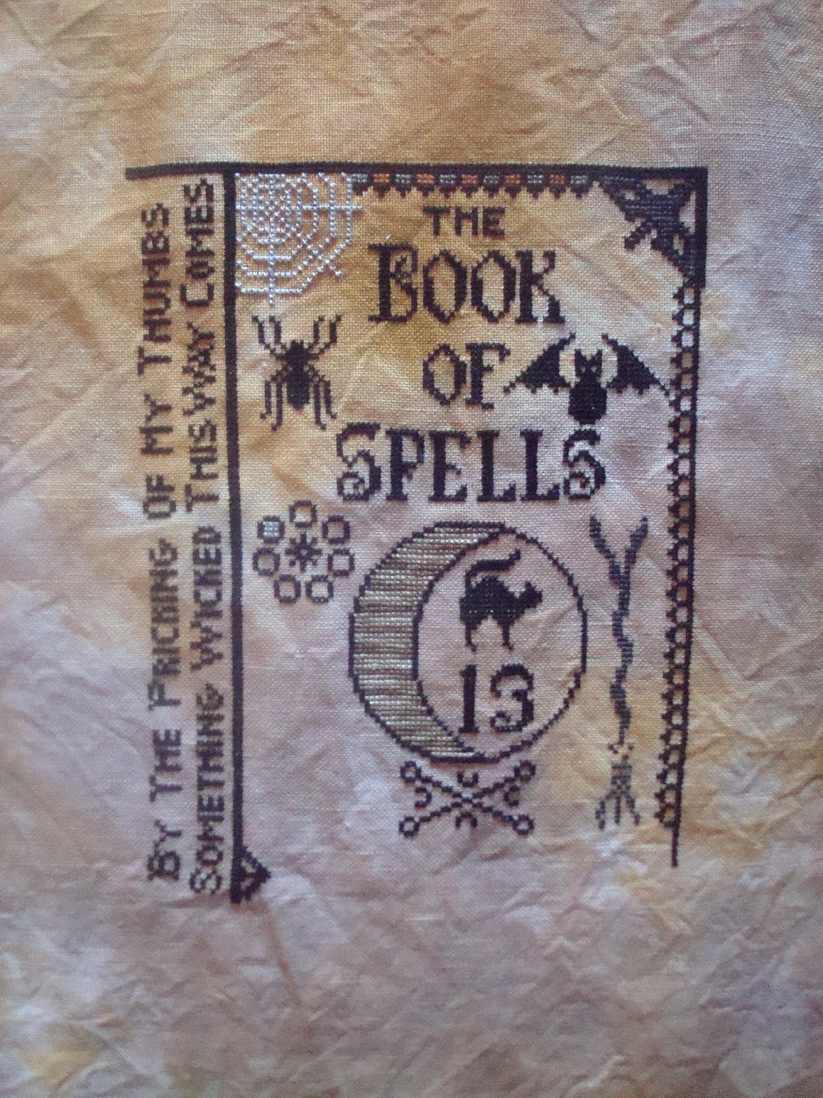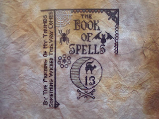 Quite alot of stitching in this block, the word SPELLS down the side of the book shows up in real life much better.